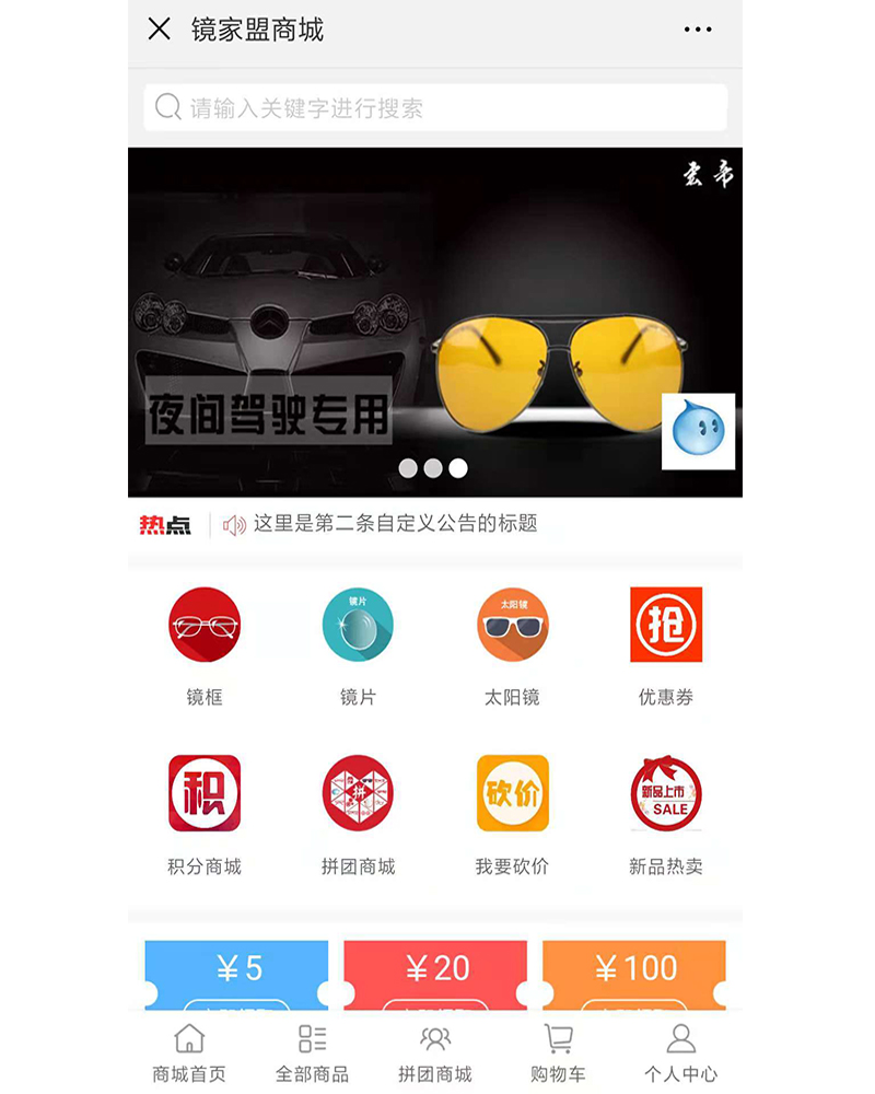 該應(yīng)用是專(zhuān)為眼鏡愛(ài)好者的購(gòu)物公眾號(hào),設(shè)計(jì)開(kāi)發(fā)積分商城、拼團(tuán)、砍價(jià)等功能模塊。
