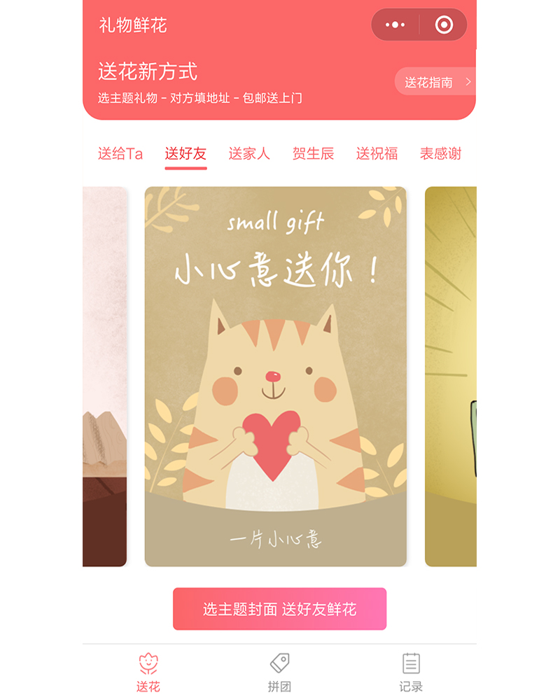 該微信公眾號(hào)是專(zhuān)業(yè)的鮮花網(wǎng)絡(luò)購(gòu)物平臺(tái),應(yīng)用開(kāi)發(fā)功能模塊有首頁(yè)、拼團(tuán)、記錄等等。